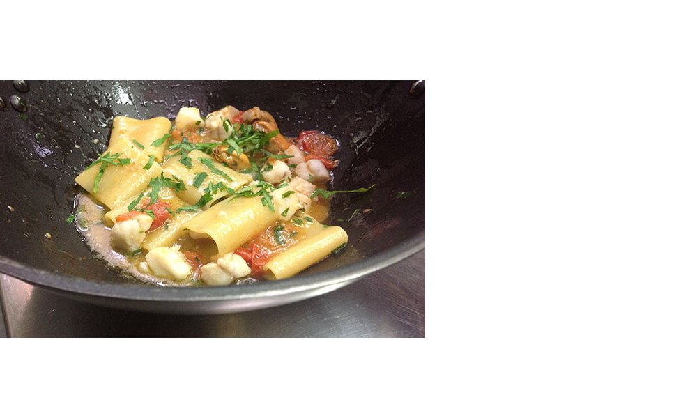 Als de mosselen en de venusschelpen openen dan is de saus klaar. Voeg er de pasta aan toe, laat nog 1 minuut stoven en serveer.