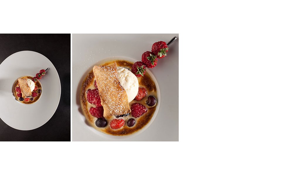 Leg in een diep bord een eetlepel van de lauwe rabarberpuree samen met de staaf rabarber, bolletje yoghurtijs en wat bosaarbeien erbij. Garneren met speculaascrunch.