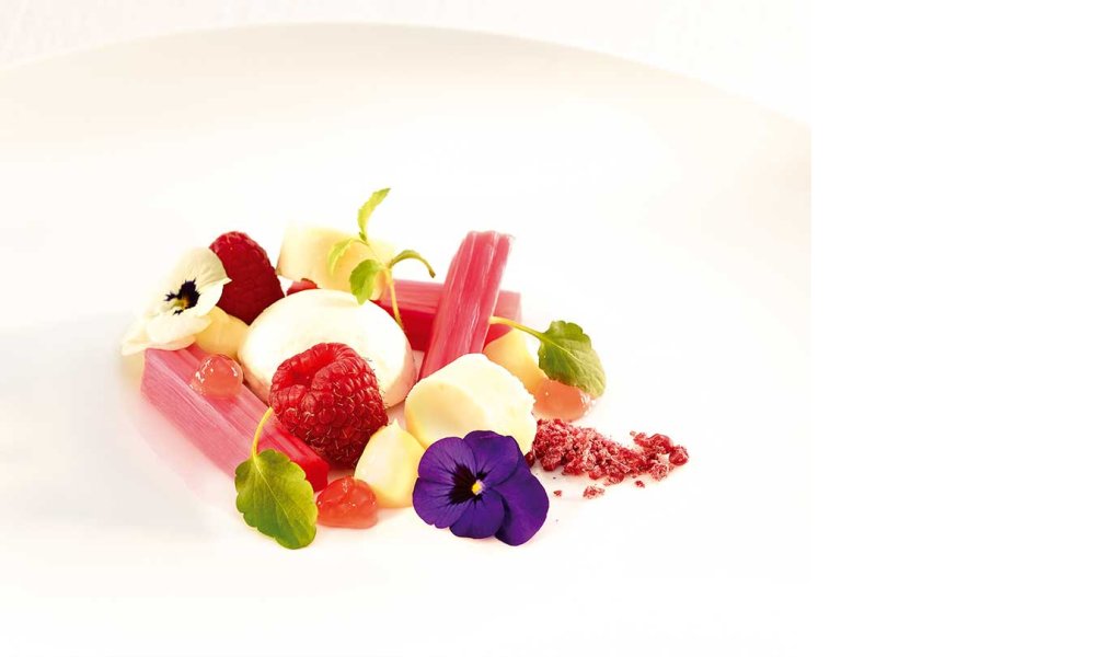 Gel van aardbei, kruiden en cremeux van witte chocolade als afwerking