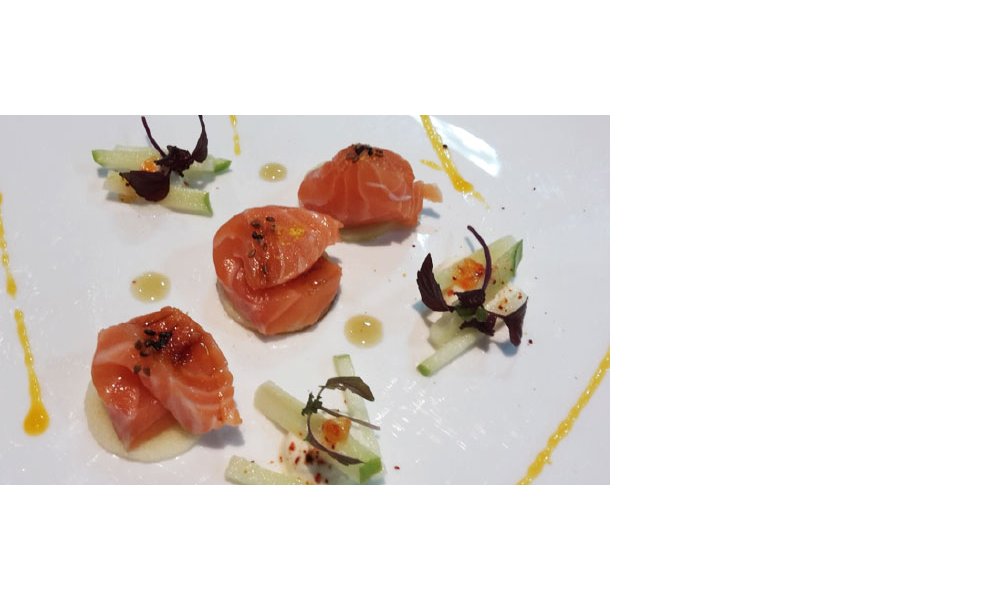 Lepel de platte kaas in een spuitzak en spuit op elk bord drie dotjes. Garneer met de appelstaafjes. Bestrooi de zalm met het mandarijnpoeder en enkele korrels grof zout.