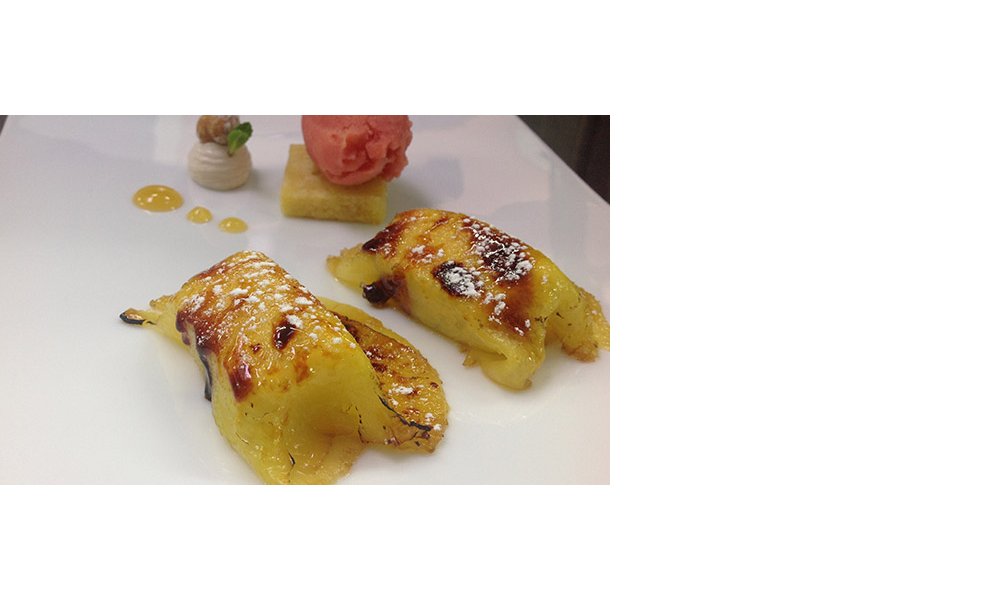 Bestrooi de ravioli met de witte basterdsuiker en karamelliseer met een bunsenbrander. Zo krijgt de ravioli een mooie textuur.