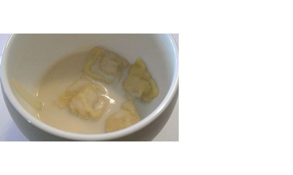 Maak raviolideeg met : 1 ei, een snuifje zout, 100 g bloem. Rol het deeg uit, verdeel de vulling over het deeg en maak er kleine ravioli mee.