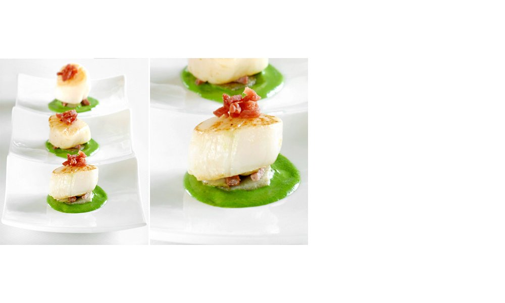 Verdeel de erwtensaus over de bordjes, leg er de Sint-Jakobsnootjes in en voeg er de julienne van gerookte eendenborst bij.