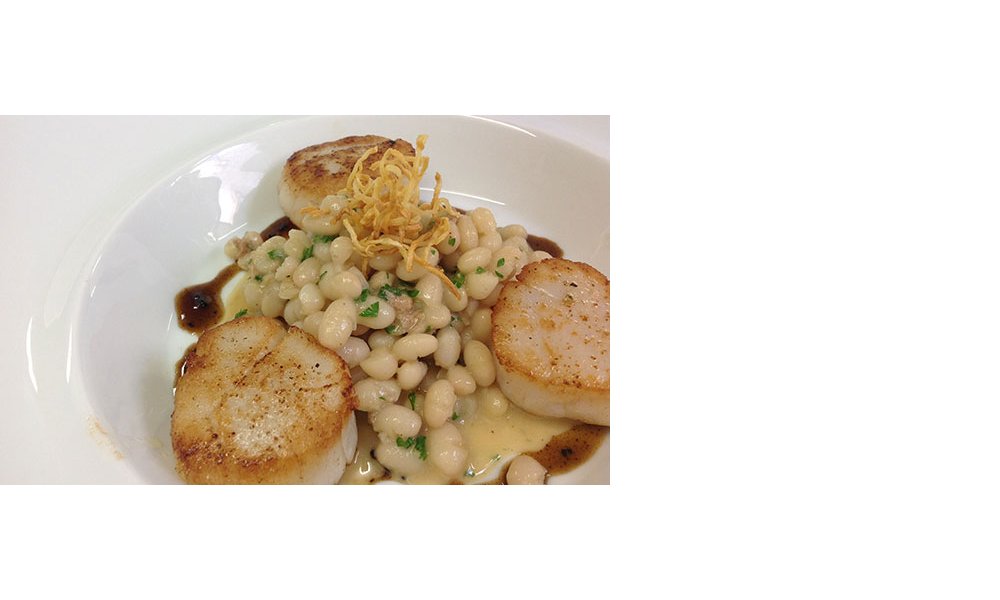 Leg de kokobonen op de bodem van een bord, voeg er een scheutje rundjus aan toe. Leg de Sint-Jakobsvruchten er boven op. Doe er als garnituur een krokant stukje knolselder bij gebakken in arachideolie.