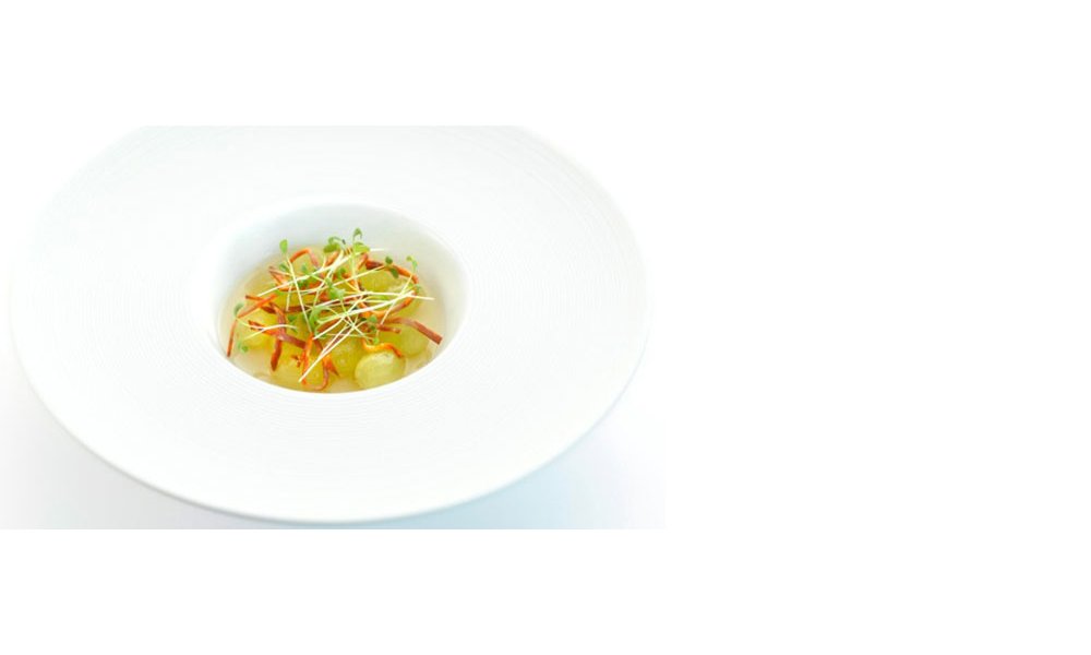 Bij het doorgeven elk bord afwerken met wat takjes tuinkers en wat fijngesneden chorizodraadjes. Dit fris en licht gerecht kan als voorgerecht of als tussengerecht na hoofdschotel fungeren.