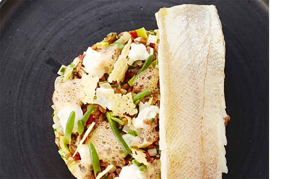 Schik de spelt op het bord, leg er enkele blokjes gerookte mozzarella op zodat de kaas wat kan smelten, schik er de zeekraal of amsoor en stukjes krokant van parmezaan tussen. Leg de steenbolkfilet erbij, mix de bisquesaus en werk af met de schuimende saus zoals op de foto.