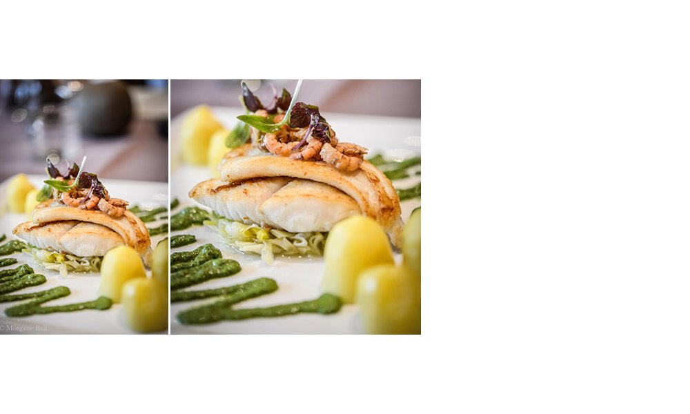 Verwarm boter en olijfolie in een pan. Bak de twee tarbotfilets aan beide kanten in de pan, voeg zout en peper toe. Haal ze uit de pan en leg ze op keukenpapier om het vet te laten uitlekken. Verdeel de prei over de borden, leg er de filets op. Spuit een mooie tekening met de pesto van waterkers op de borden. Doe er de