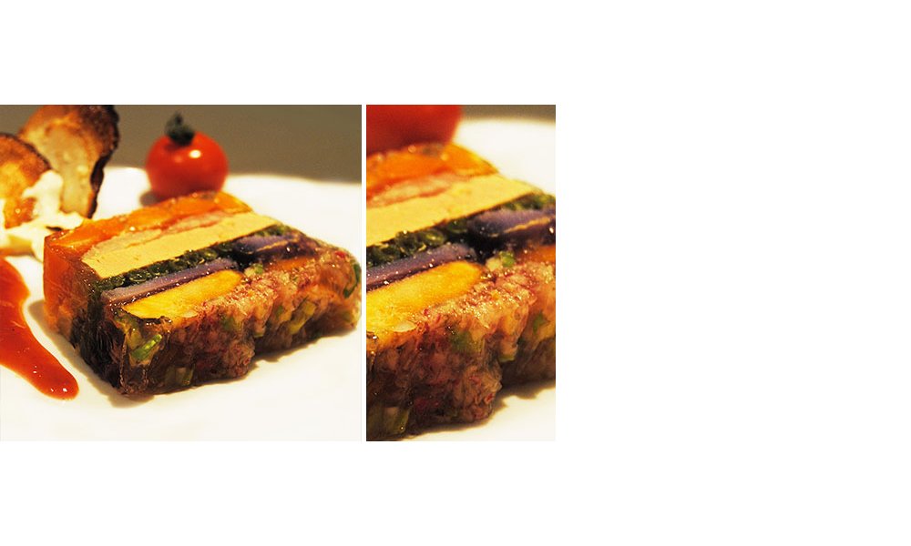 Leg een dubbele laag folie in een rechthoekige terrine en giet er een dunne laag gelei in. Leg er in de lengte de wortelstaafjes op en overgiet met wat gelei. Leg er de meiraap op en overgiet met gelei. Schik er de boontjes op en overgiet met gelei. Leg er naast elkaar de sneden foie gras op en overgiet met gelei. Leg daarop de aardappelen en overgiet met gelei. Dek af met koolraap. Meng de peterselie met de rest van de gelei en giet over de volledige terrine. Laat 24 uur afkoelen in de koelkast.