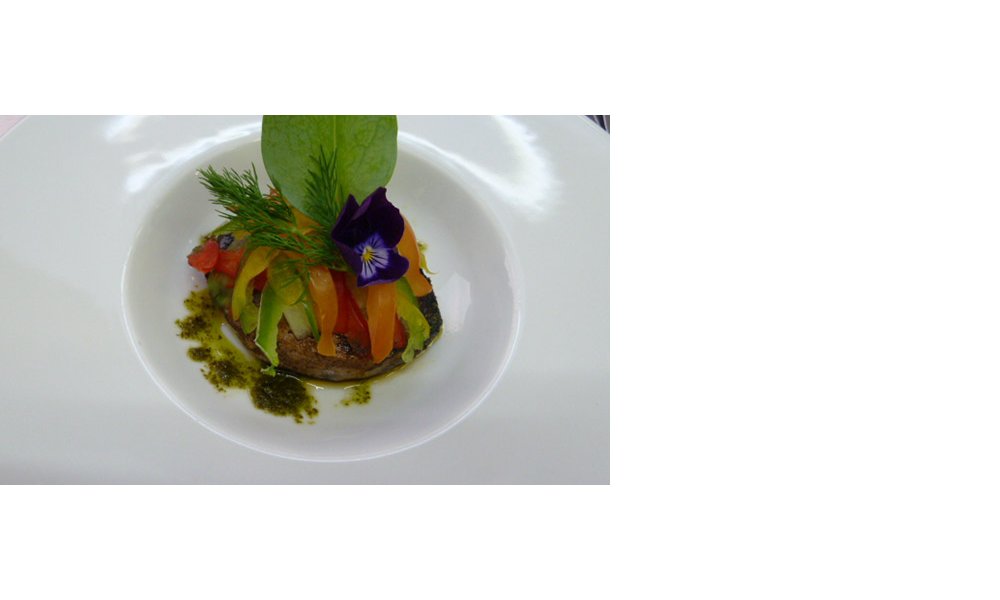 Laat de tonijn uitlekken. Bak ze vervolgens even om en om in een warme pan met een scheut olijfolie. Leg de gebakken tonijn in een warm bord en leg er de groenten op. Druppel er de pesto over. Breng verder op smaak en garneer volgens je eigen inspiratie.