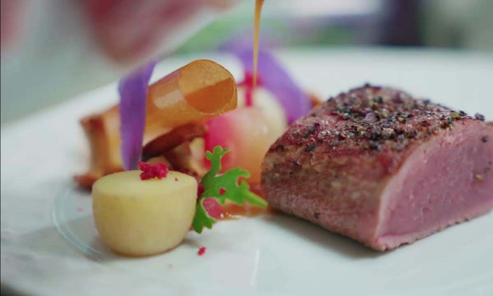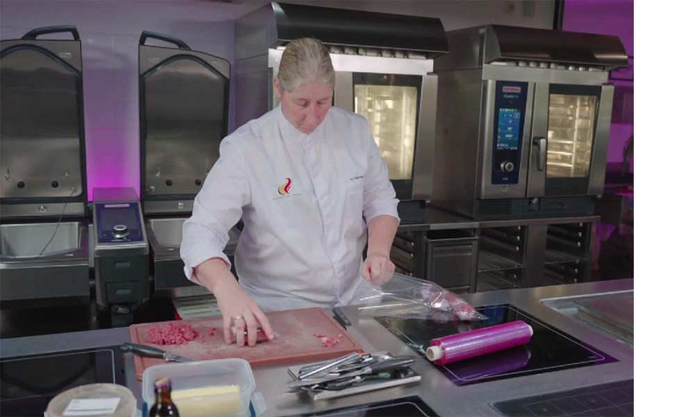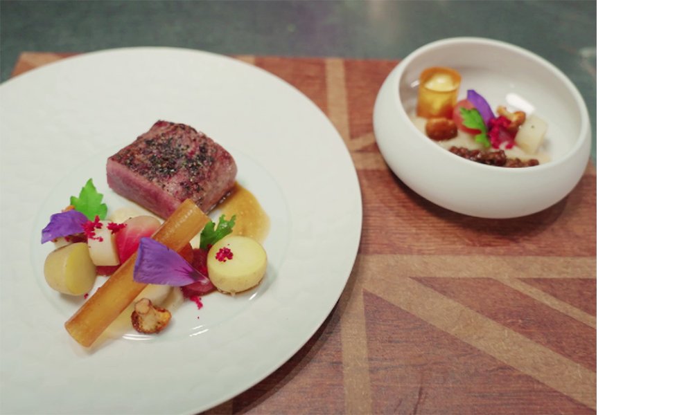 - Gaar de lamsfilet gedurende 23 min sous-vide op 56°C en laat afkoelen in een ijsbad.