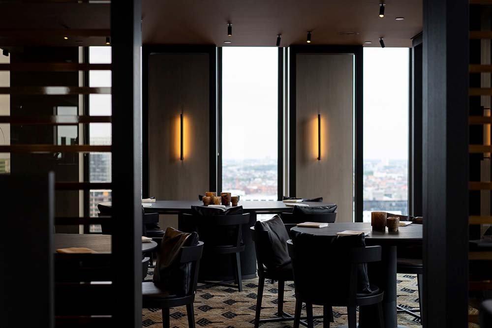 Viki Geunes: "We zitten op een speciale plek (lachend) letterlijk hoog boven Antwerpen. We zijn hier nu 10 jaar en vonden 2 jaar terug dat de setting achterhaald was en we een nieuwe look moesten geven aan het restaurant. We begonnen erover na te denken en op een avond werd het idee geopperd: waarom niet aan de andere kant van het gebouw op dezelfde verdieping een nieuw restaurant 'bouwen'. We konden alles meteen een ander look en feel geven en onze gasten letterlijk een ander uitzicht want je kijkt uit op een ander stuk Antwerpen, met name de oude stad. Voordeel was dat we operationeel konden blijven op de oude plek terwijl we de andere zijde ombouwden tot het nieuwe Zilte. Niet onbelangrijk want de verkassing zou een zeer zware investering zijn.