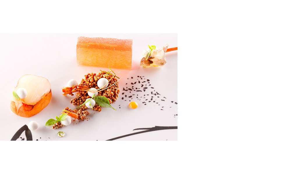 Prikkelen. Zowel met smaak en uitzicht. Mensen doen verwonderen. Het hoort er voor een stukje bij in onze job. Uit eten gaan is entertainment. Ik wil gasten ook graag af en toe verrassen. Ze met een knipoog op het verkeerde been zetten. Zoals hier met een stukje watermeloen dat ik bewerkt heb zodat het een umami smaakje krijgt. Watermeloen heeft in zijn oorspronkelijke vorm weinig smaak en geniet vooral als dorstlesser verdienste. Daarom dat ik hier iets aan toegevoegd heb dat je niet meteen zal verwachten. Verder heb ik parels gemaakt van feta door de kaas eerst tot een romige coulis te verwerken en daarna in vloeibaar stikstof te droppen. Amaranth is gepoft met olie van gambakoppen en een speciale vinaigrette zorgt voor de bindende smaak tussen de gamba en alle andere componenten.