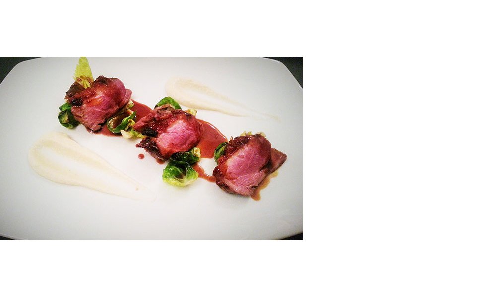 Yuzu-Glazed Muscovy Duck Breast with Port-wine Figs, Celery Root Puree and Brussels sprouts Leaves - Steven De Bruyn