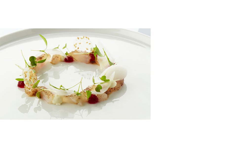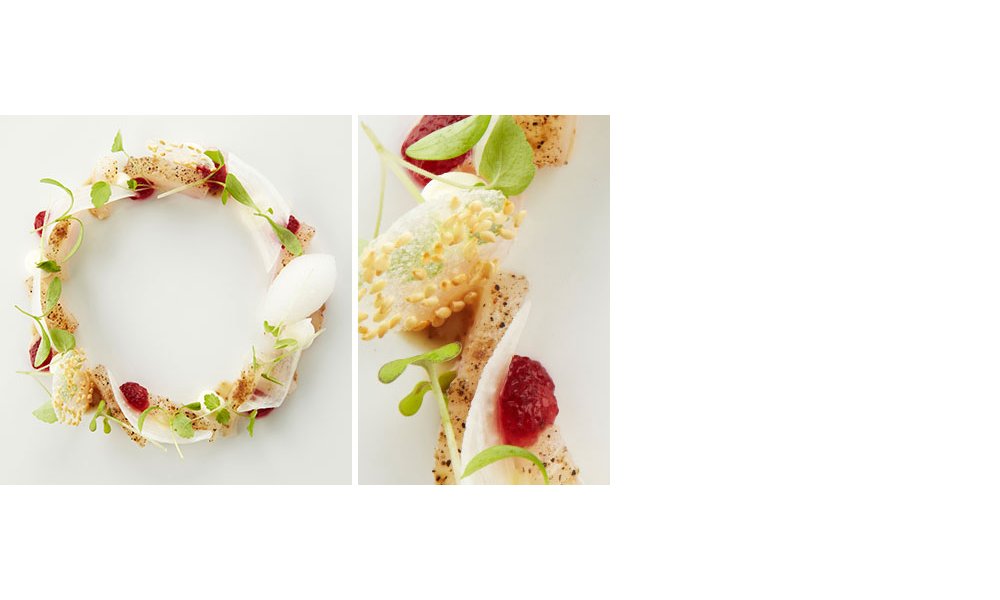 Verdeel de zeebaars in een kring over het bord en werk af met de ijspegels, hibiscus, saké en dressing.