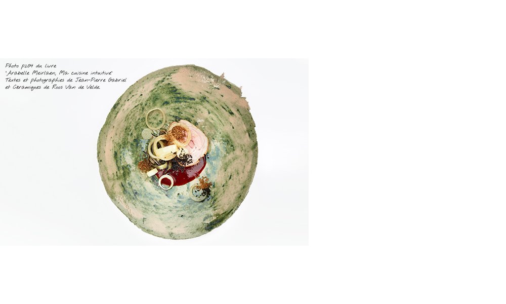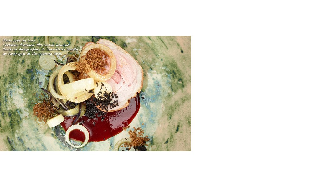 Leg de auberginetagliatelle op het bord. Leg daarop het in sneetjes van 2 cm dik gesneden lamsvlees. Leg er de gekruide knolschijfjes bij. Giet er de warme vlierketchup over. Leg broodkruim en olijvenpoeder aan één zijde van het vlees om af te werken.