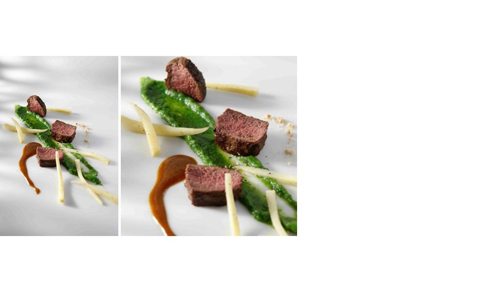 Verdeel het hert in porties van 4 cm groot. Kruid met peper en zout. Braad het hert mooi aan in de boter en bak vervolgens mooi rosé. Laat ze nog even rusten op een plaat onder aluminiumfolie. Blus de pan met de wildfond. Voeg een eetlepel puree toe om te binden. Laat inkoken tot de helft en mix.