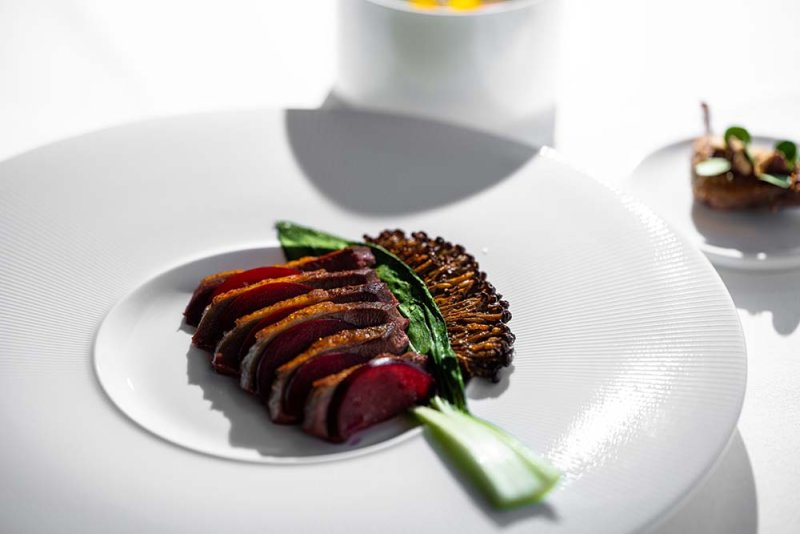 KS: “J’ai une préférence pour le pigeonneau car il permet de faire un tas de choses. J’aime aussi travailler la viande de veau. Nous n’en utilisons pas seulement les morceaux les plus nobles mais aussi tous les autres. La tête, la longe, les joues… Et nous en réalisons toutes sortes de préparations.